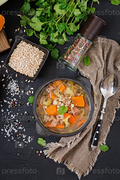 Густой суп с телятиной, перловкой, тыквой и сельдереем. Диетическое меню. Вид сверху