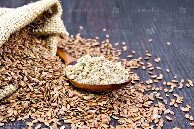 Мука льняная в ложке с семенами и мешком на доске