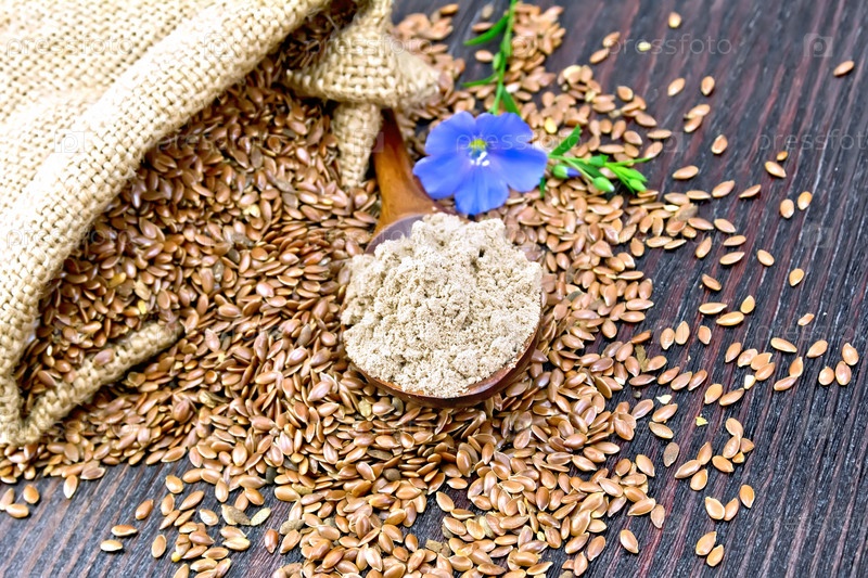 Мука льняная в ложке с семенами и цветком на доске