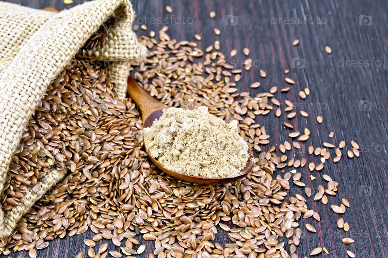 Мука льняная в ложке с семенами на доске