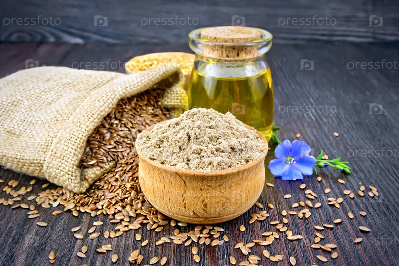 Мука льняная в чаше с маслом и цветком на доске