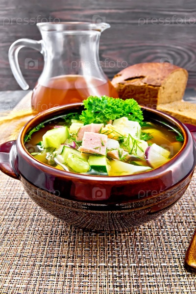 Окрошка в глиняной чаше на коричневой салфетке