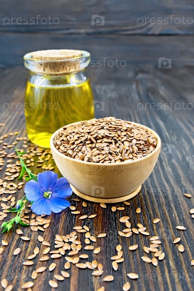 Семя льняное коричневое в чаше с цветком и маслом на доске