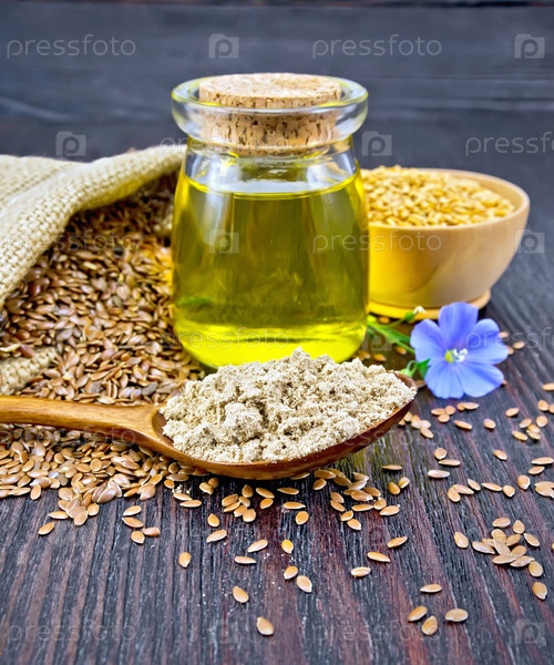 Мука льняная в ложке с маслом и цветком на доске