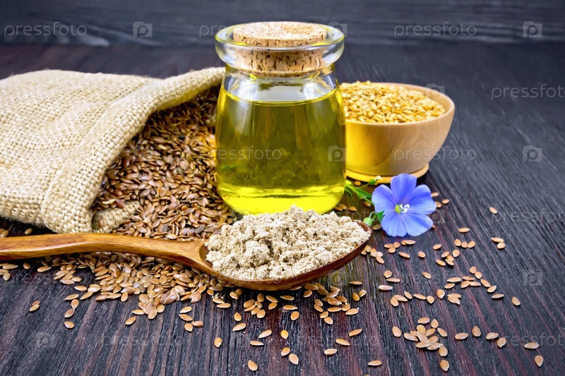 Мука льняная в ложке с маслом и семенами на доске