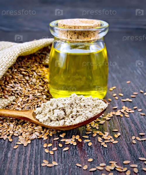 Мука льняная в ложке с маслом на доске