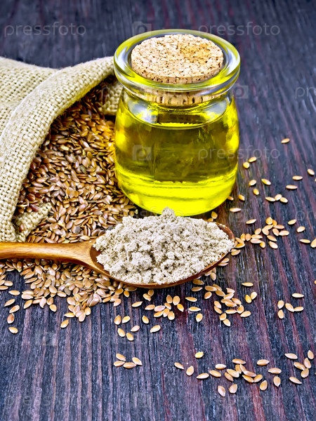 Мука льняная в ложке с семенами и маслом на темной доске