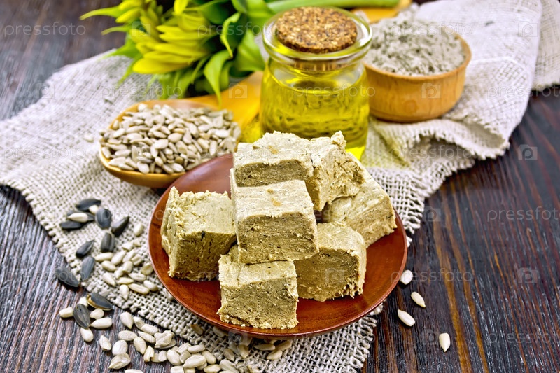 Халва в тарелке с семечками на доске