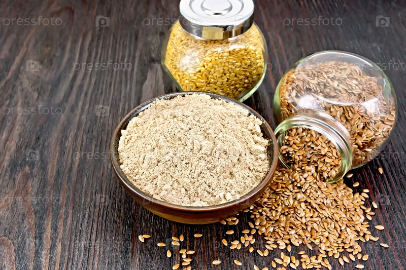 Мука льняная в чаше с семенами в стеклянных банках на доске