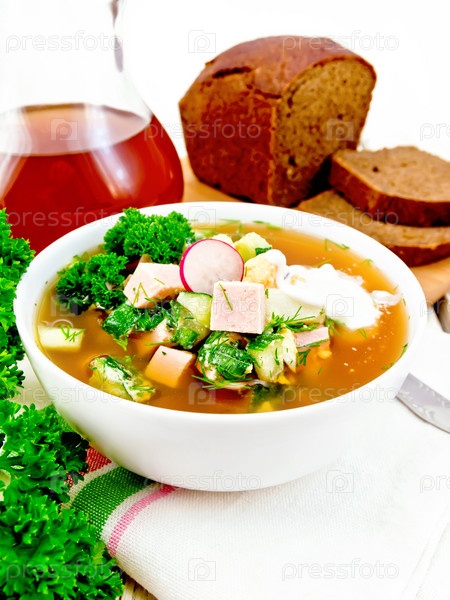 Окрошка в белой чаше на светлой доске