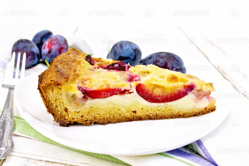 Пирог сливовый со сметанным кремом в тарелке на салфетке