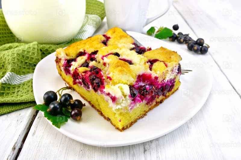 Пирог с черной смородиной в тарелке на светлой доске