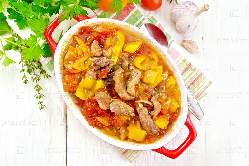 Рагу из мяса и овощей в жаровне на доске