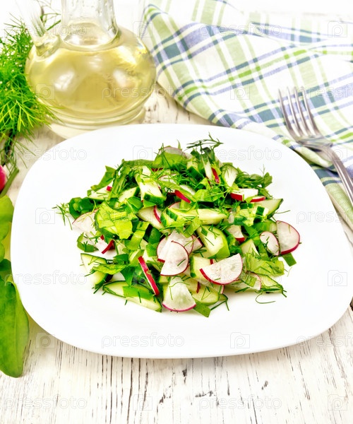 Салат из редиса и щавеля с маслом в тарелке на доске