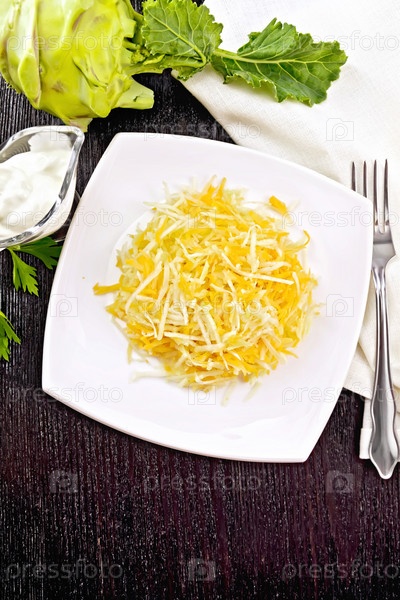 Салат из моркови и кольраби на темной доске сверху