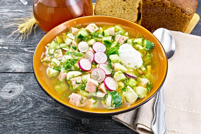 Окрошка в чаше с салфеткой на черной доске