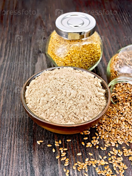 Мука льняная в чаше с семенами в банках на доске