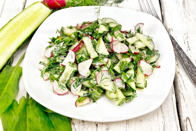 Салат из редиса и щавеля с майонезом в тарелке на доске