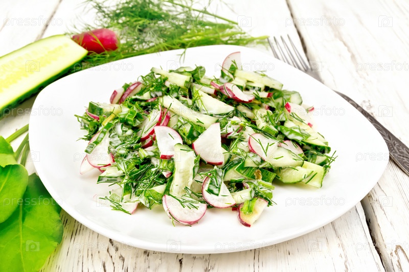 Салат из редиса и щавеля с майонезом в тарелке на светлой доске