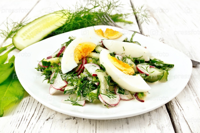 Салат с редисом и яйцом в тарелке на светлой доске