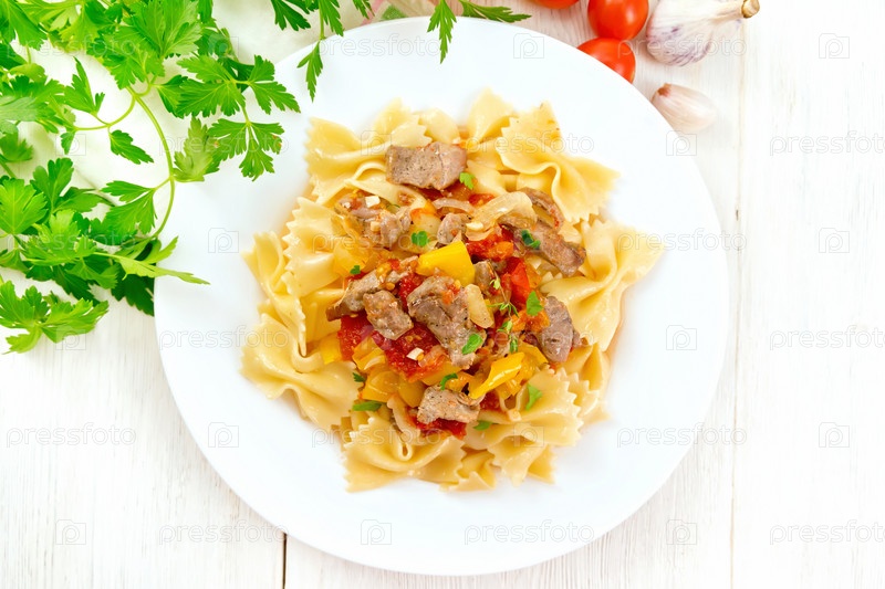 Фарфалле с индейкой и овощами на светлой доске