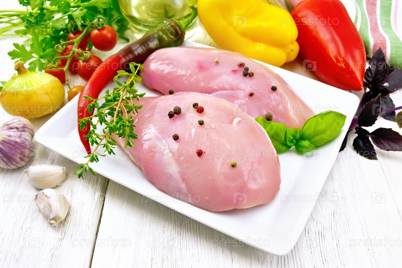 Куриная грудка сырая в тарелке с овощами и специями на столе