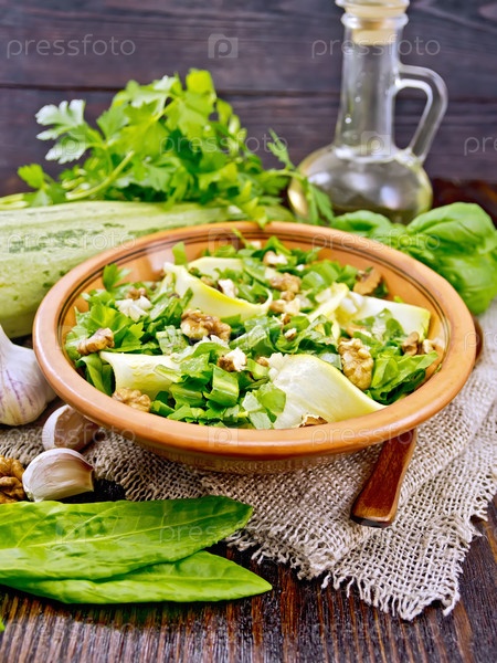 Салат с кабачком и щавелем в тарелке на доске