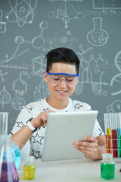 Веселый ученик в классе химии