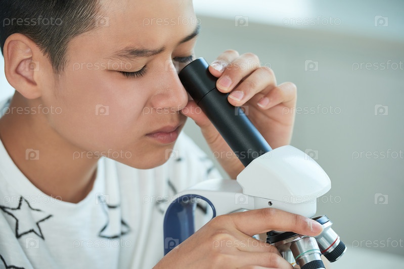 Любопытный подросток с микроскопом