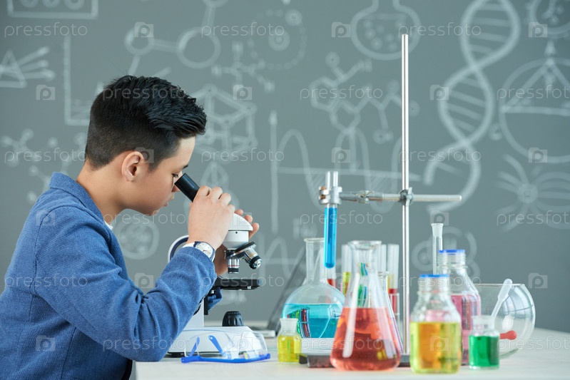 Молодой исследователь с микроскопом