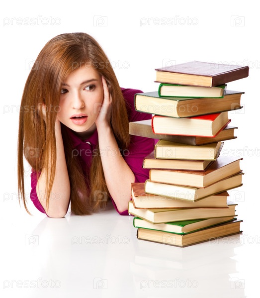 Молодая девушка и стопка книг
