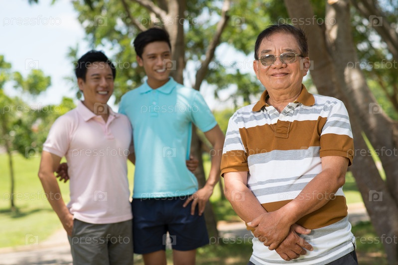 Веселый пожилой мужчина со своей семьей