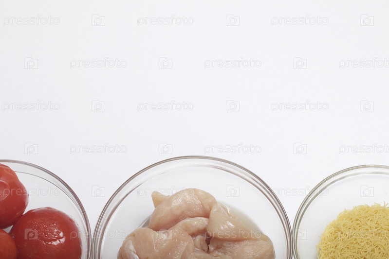 Ингредиенты для томатного супа: вермишель, куриное филе и помидоры