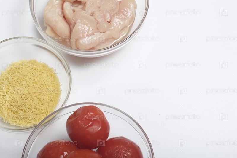 Ингредиенты для томатного супа: вермишель, куриное филе и помидоры
