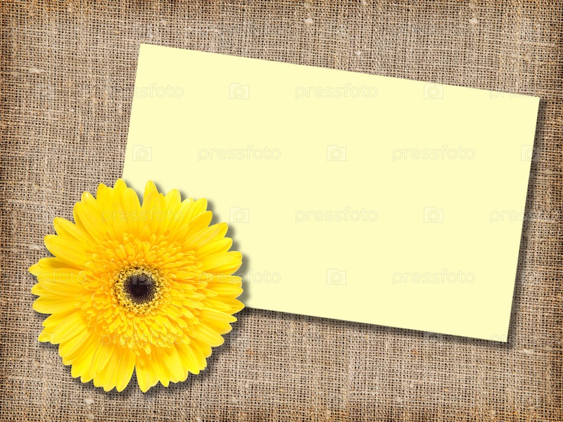Пустая карточка и желтый цветок на текстильном фоне