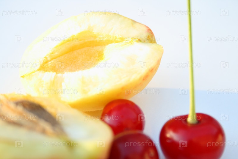 Спелая вишня и половинки абрикоса на белом фоне