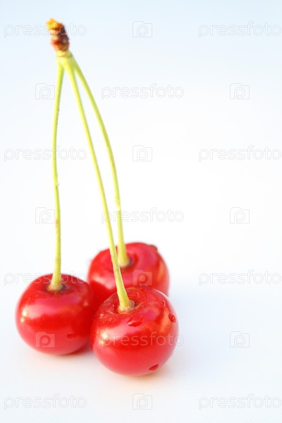 Три спелые вишенки на белом фоне