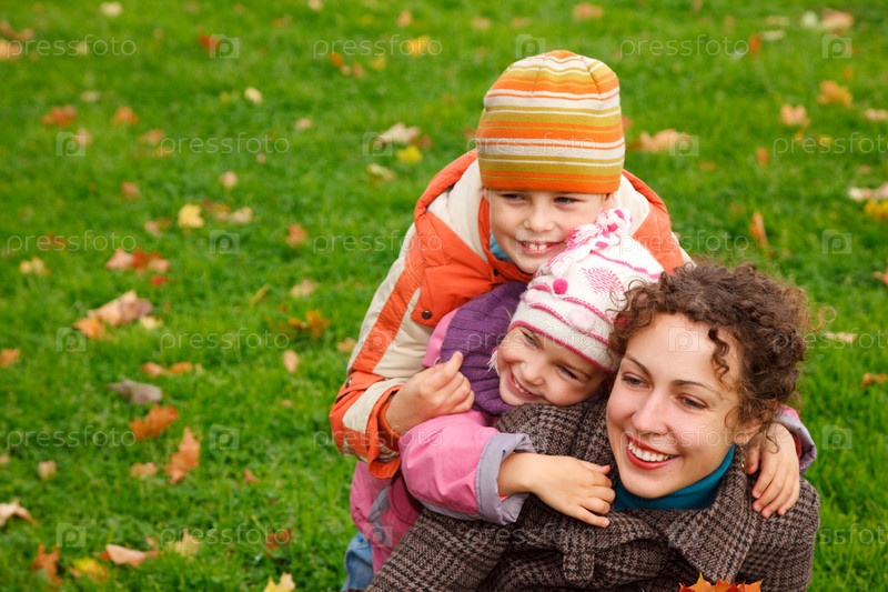 Мама с детьми играет в осеннем парке