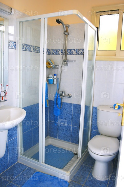 Душевая кабина в голубой ванной