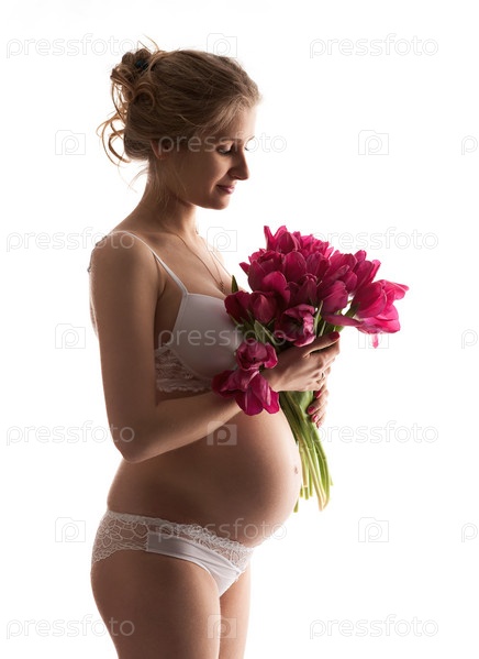 Красивая молодая беременная женщина в белье держит цветы