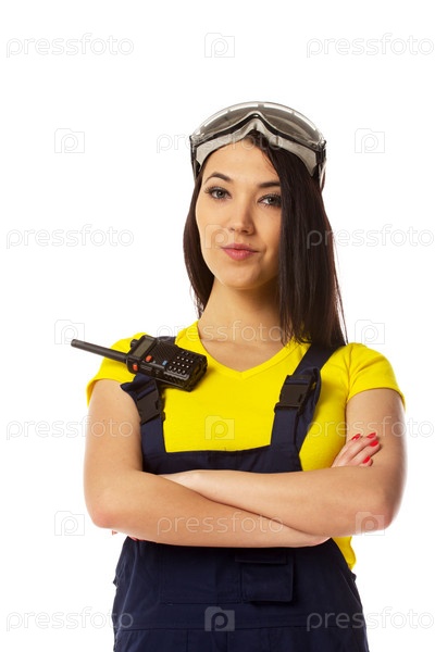 Серьезная женщина-строитель с рацией