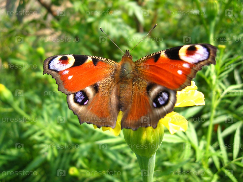 Бабочка павлиний глаз сидит на цветке