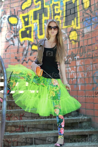 Девушка в эксцентричном наряде у стены с граффити