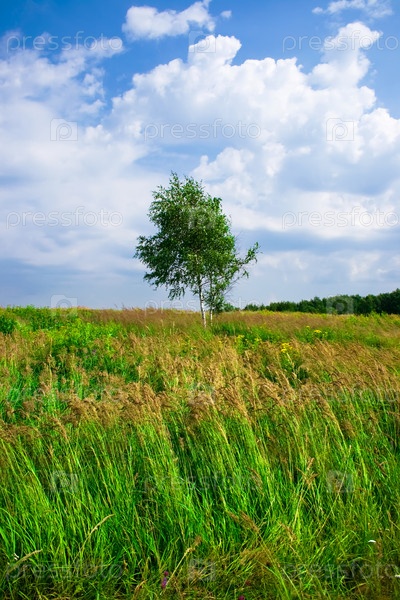 Одинокое дерево в зеленом поле под голубым небом, Россия