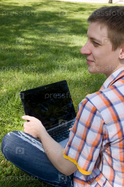 Молодой человек на траве с ноутбуком