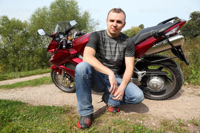 Мужчина сидит рядом с мотоциклом на проселочной дороге