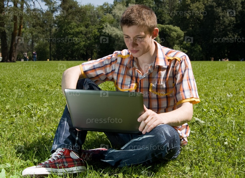 Молодой человек сидит на траве с ноутбуком