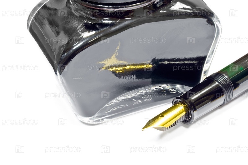 Банка чернил и перьевая ручка на белом фоне