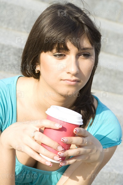 Молодая девушка пьет кофе