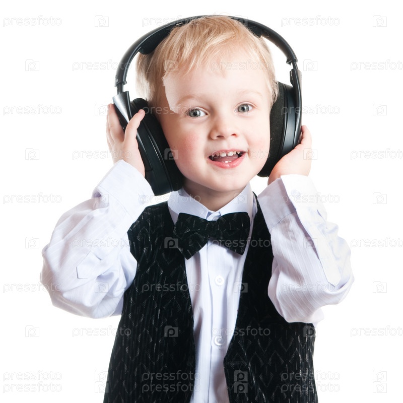 Мальчик с наушниками, изолированный на белом фоне